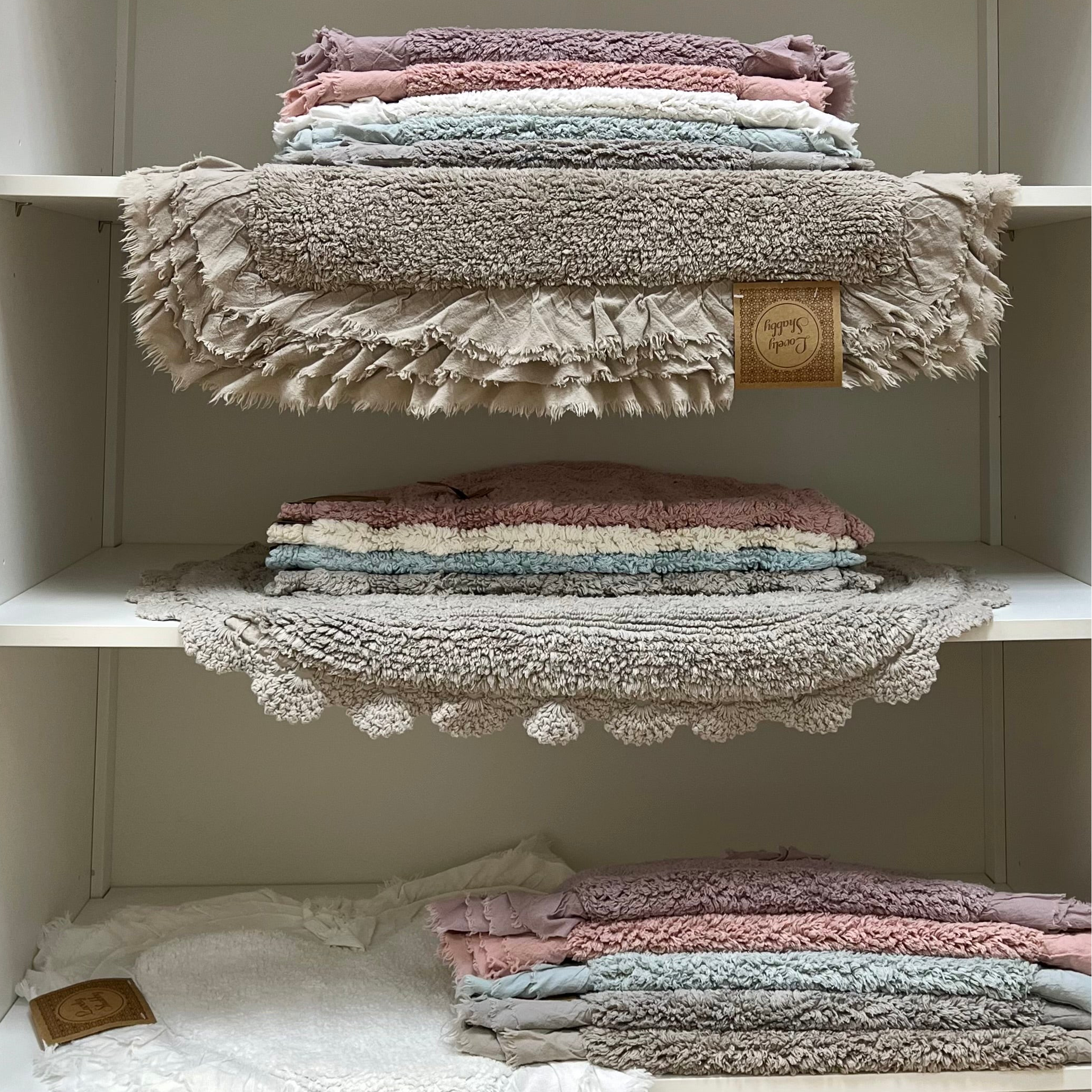 Il tappeto Liz, dallo stile shabby, romantico ed elegante, è ideale per qualsiasi bagno. Realizzato al 100% in soffice spugna di cotone.