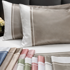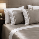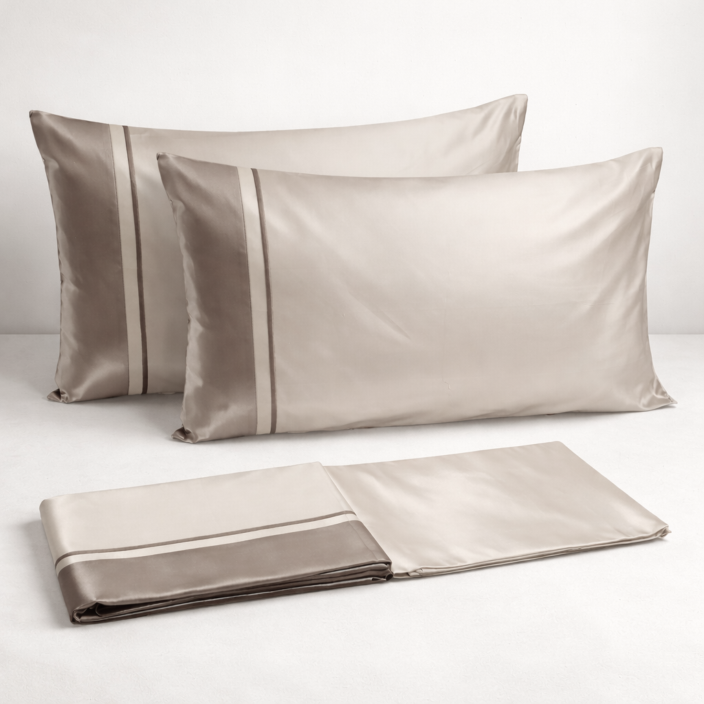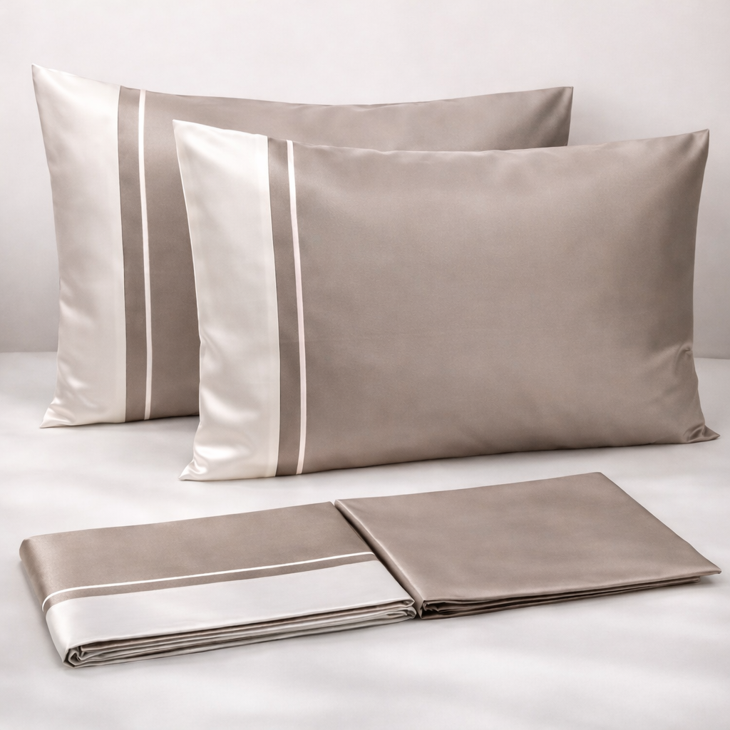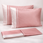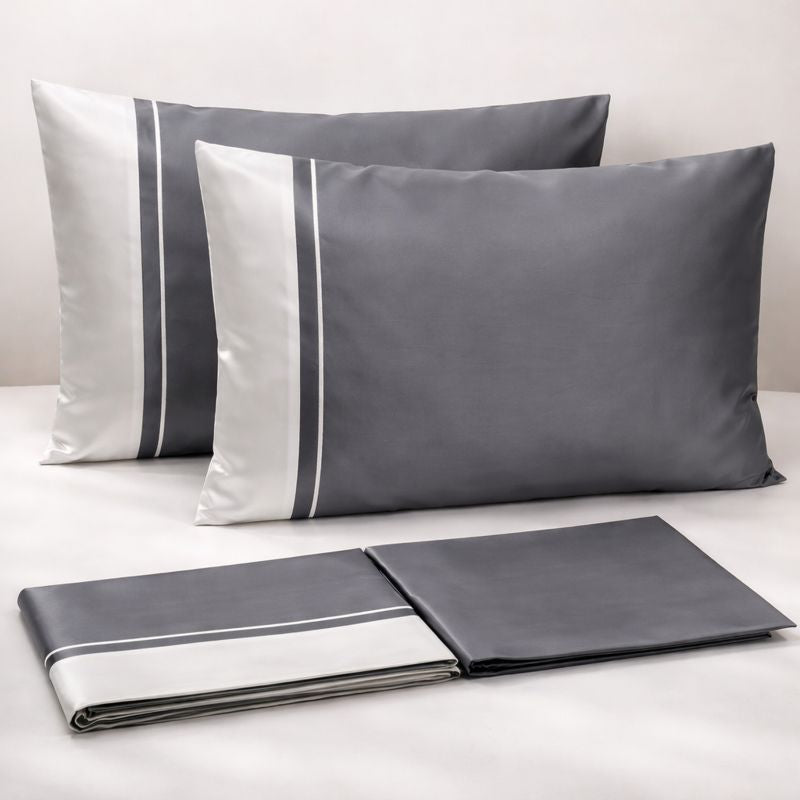 Il design è valorizzato dalla tinta unita con balza a contrasto, arricchita da sottile cordonetto ricamato, per uno stile elegante e raffinato che impreziosisce la camera da letto. Il lenzuolo sopra è in tinta unita con balza a contrasto; le federe sono a sacchetto, anch'esse in tinta unita con balza a contrasto e sottile cordonetto ricamato; il lenzuolo da sotto è invece interamente in tinta unita.