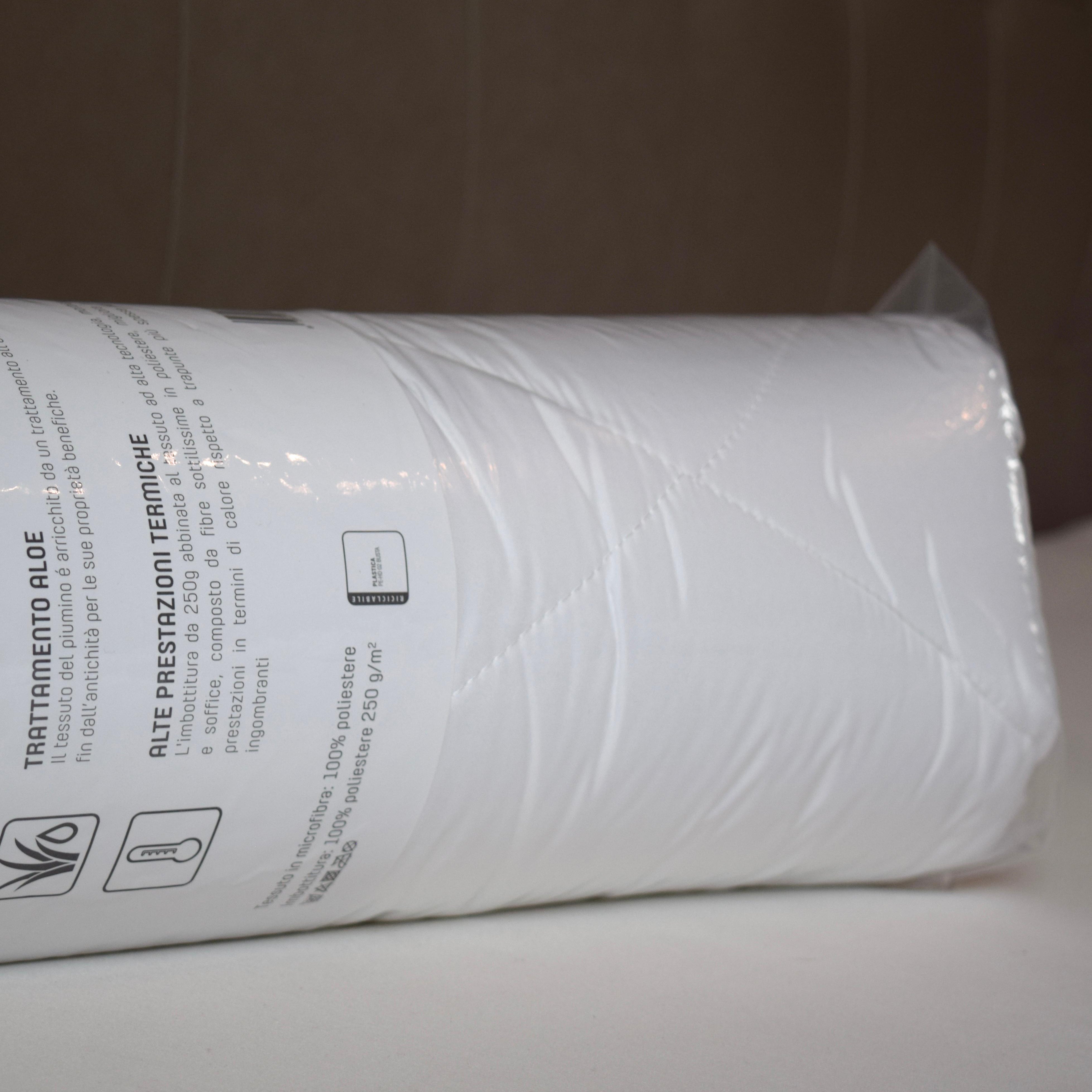 Pesantezza: 250 gr/mq. Caratteristiche: il tessuto del piumino è arricchito da un trattamento all'aloe vera, conosciuta per le sue proprietà benefiche. Grazie a milioni di microcapsule che resistono ai lavaggi, il suo rivestimento è veicolo di benessere, poiché svolge azione idratante e lenitiva sulla pelle.