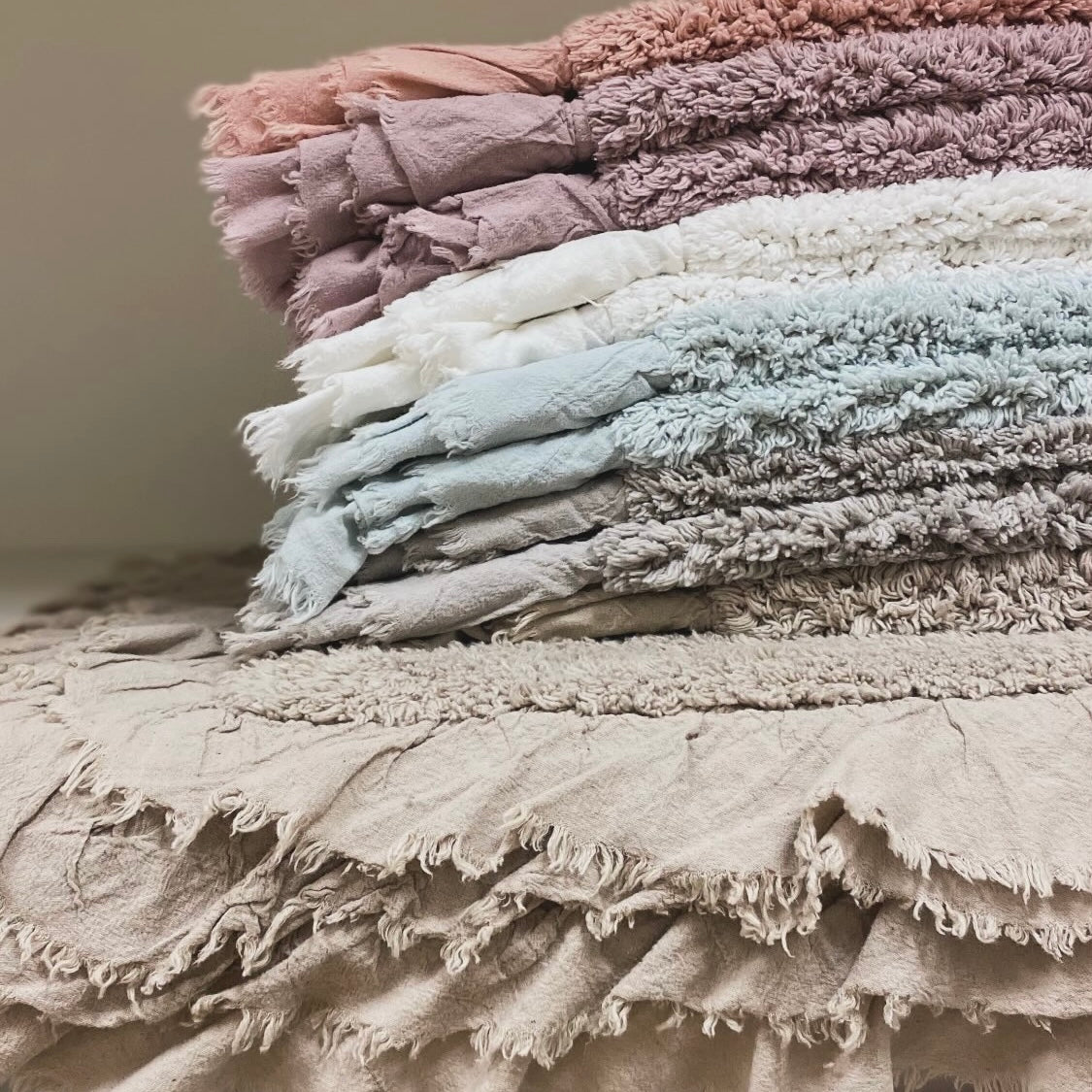 La sua forma, il bordo finemente lavorato con triplo volant e le sei colorazioni disponibili (rosa, malva malva, azzurro, bianco, tortora, grigio) lo rendono un complemento perfetto per ogni ambiente.