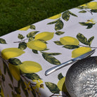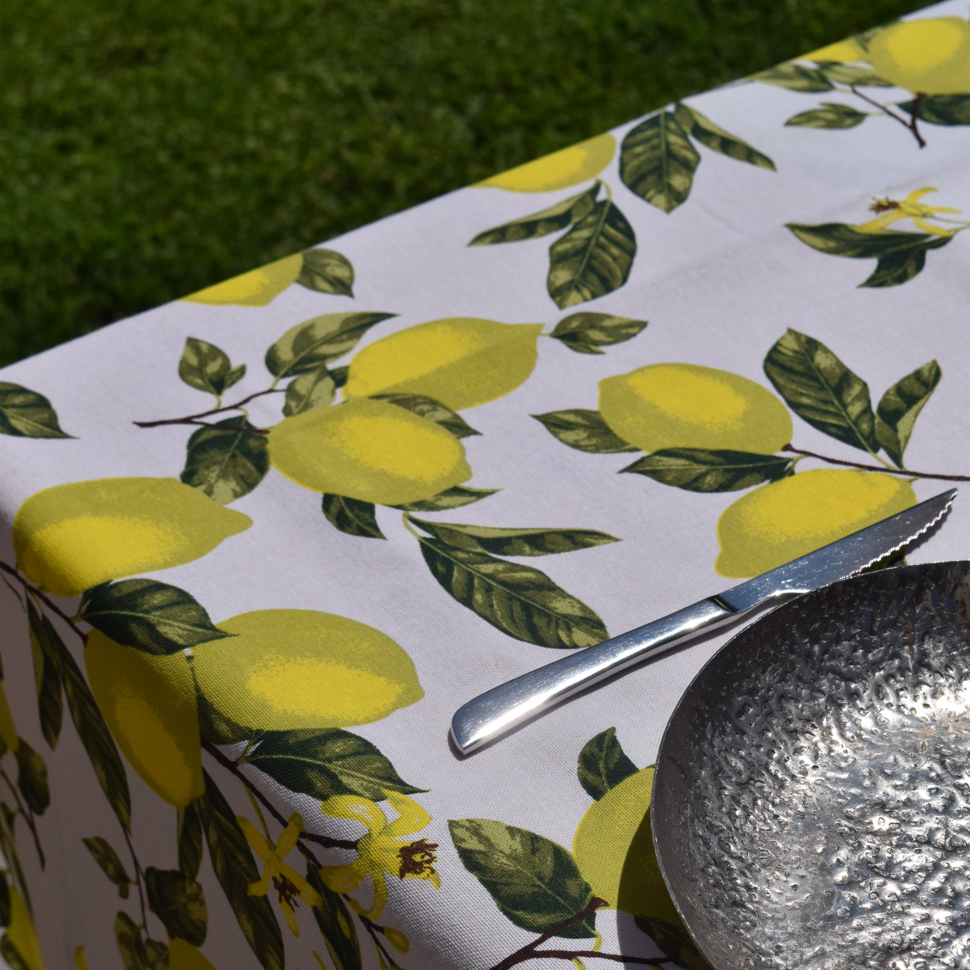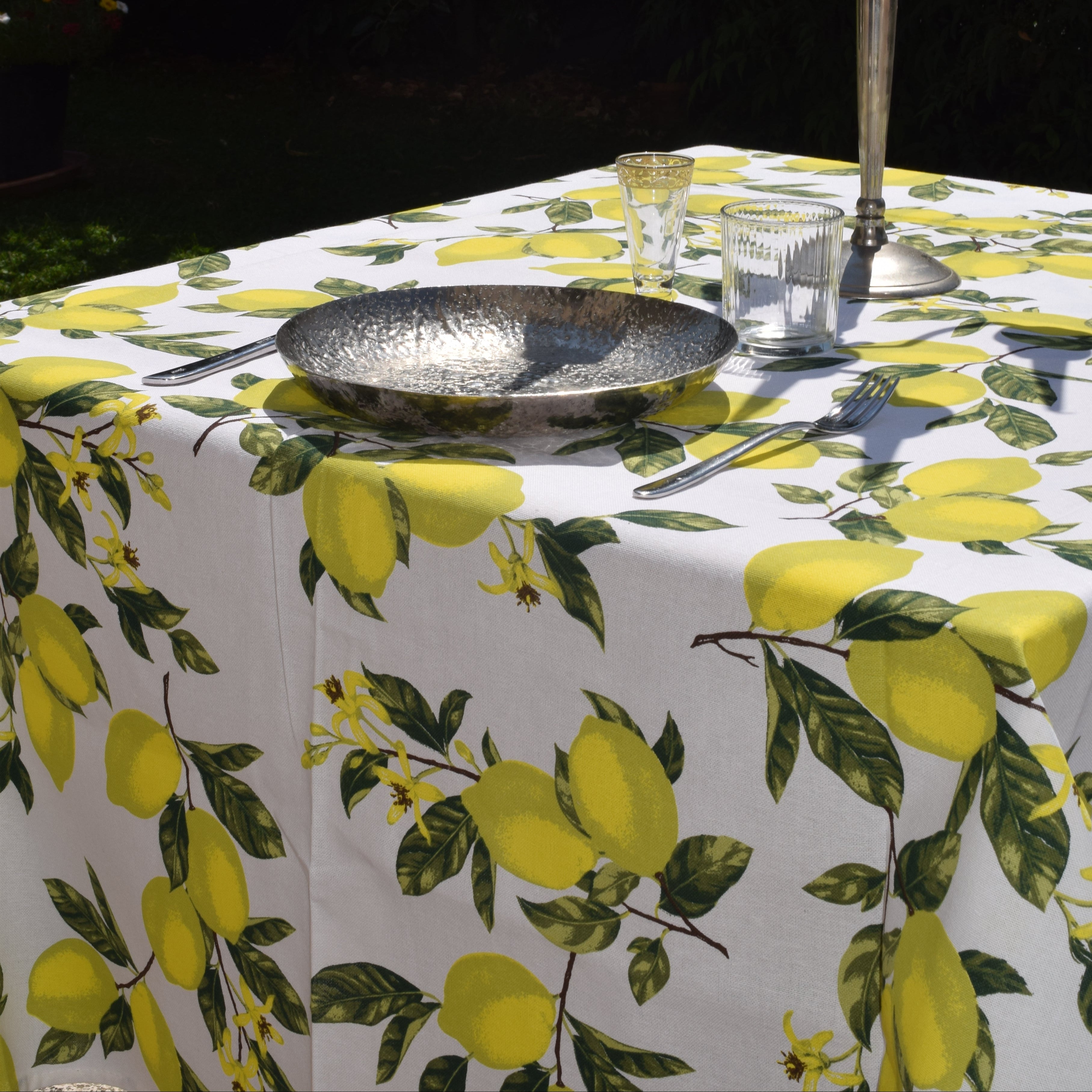 Tovaglia Limoni, composizione 80% di cotone e 20% di poliestere per facilitare il lavaggio e ridurne il calo; Prodotto made in Italy