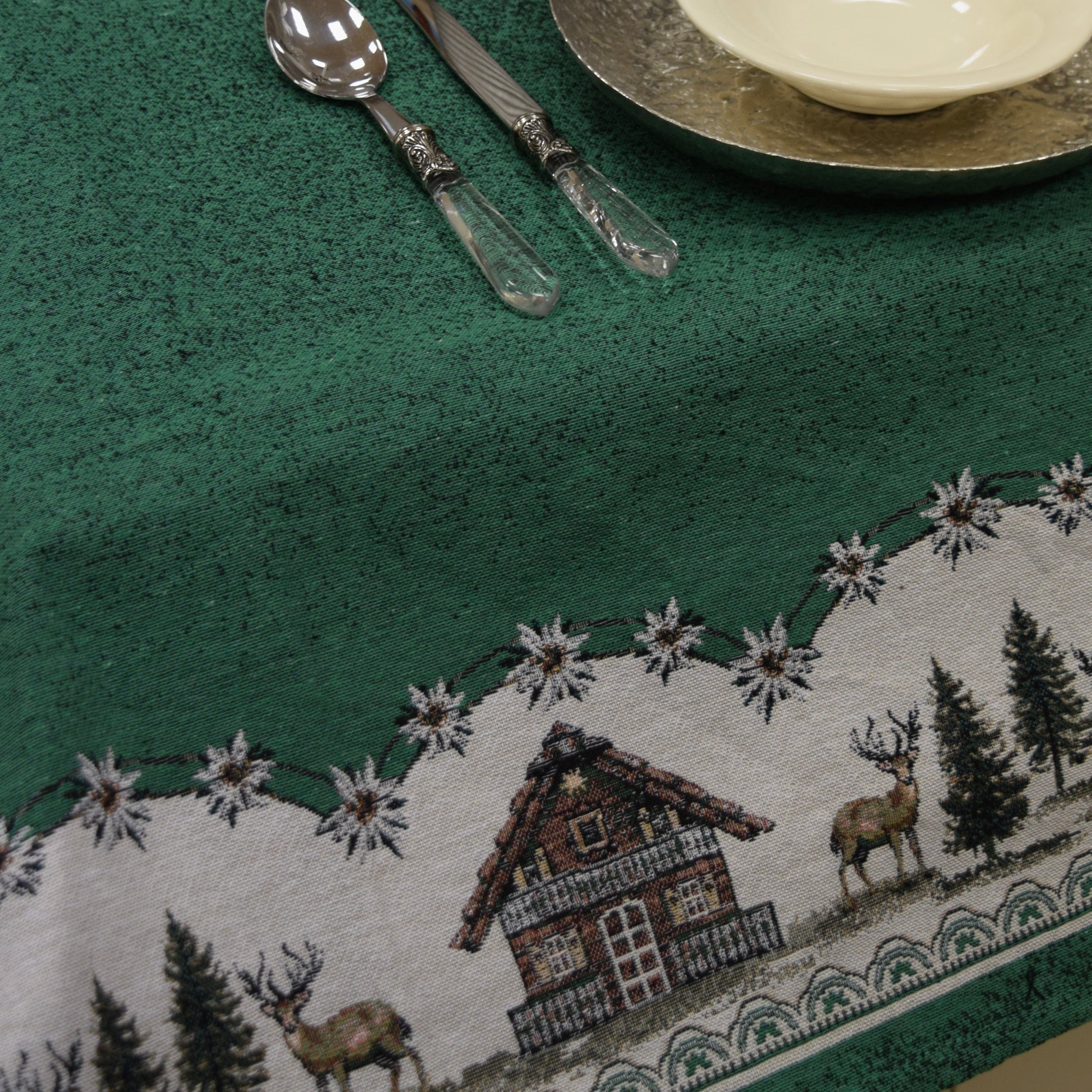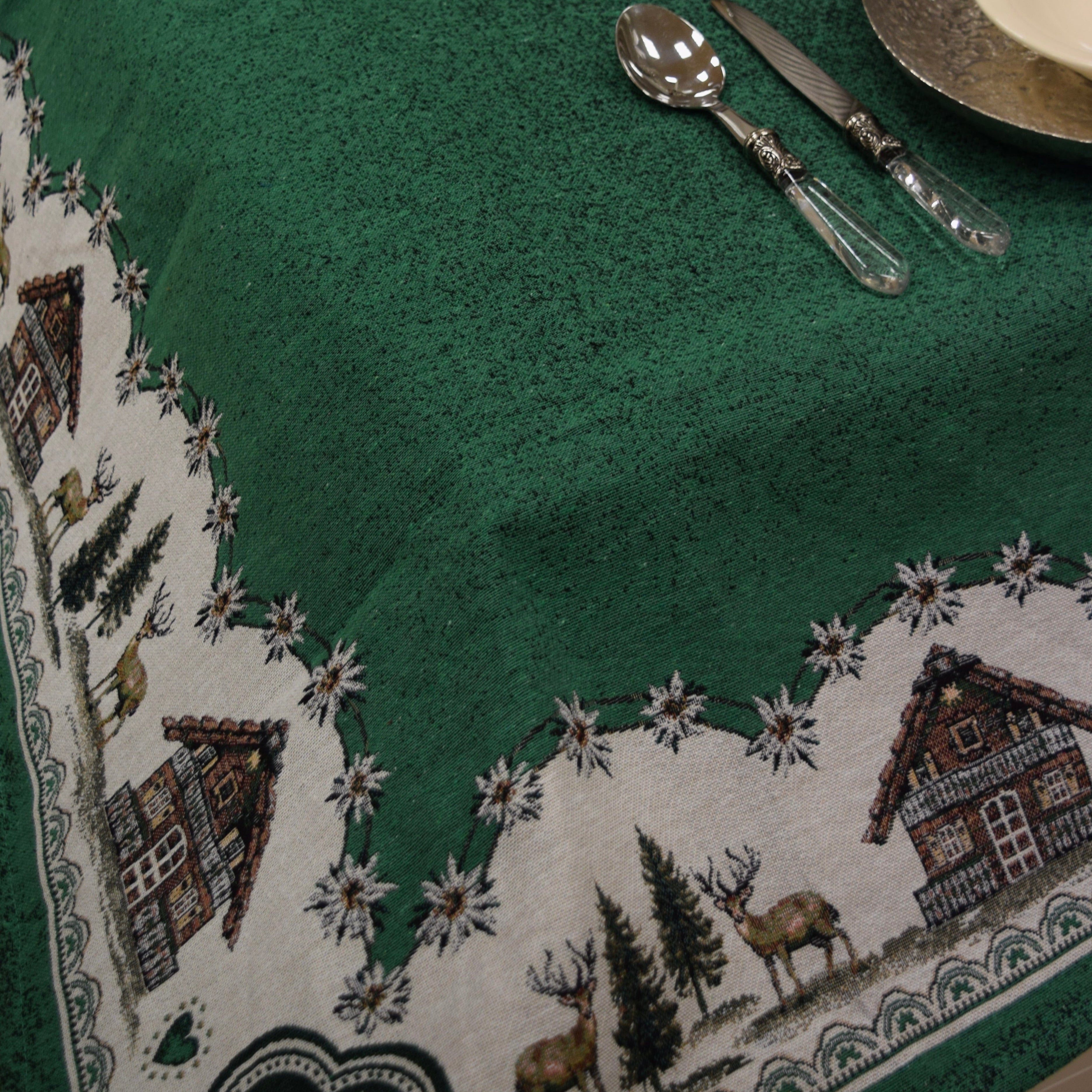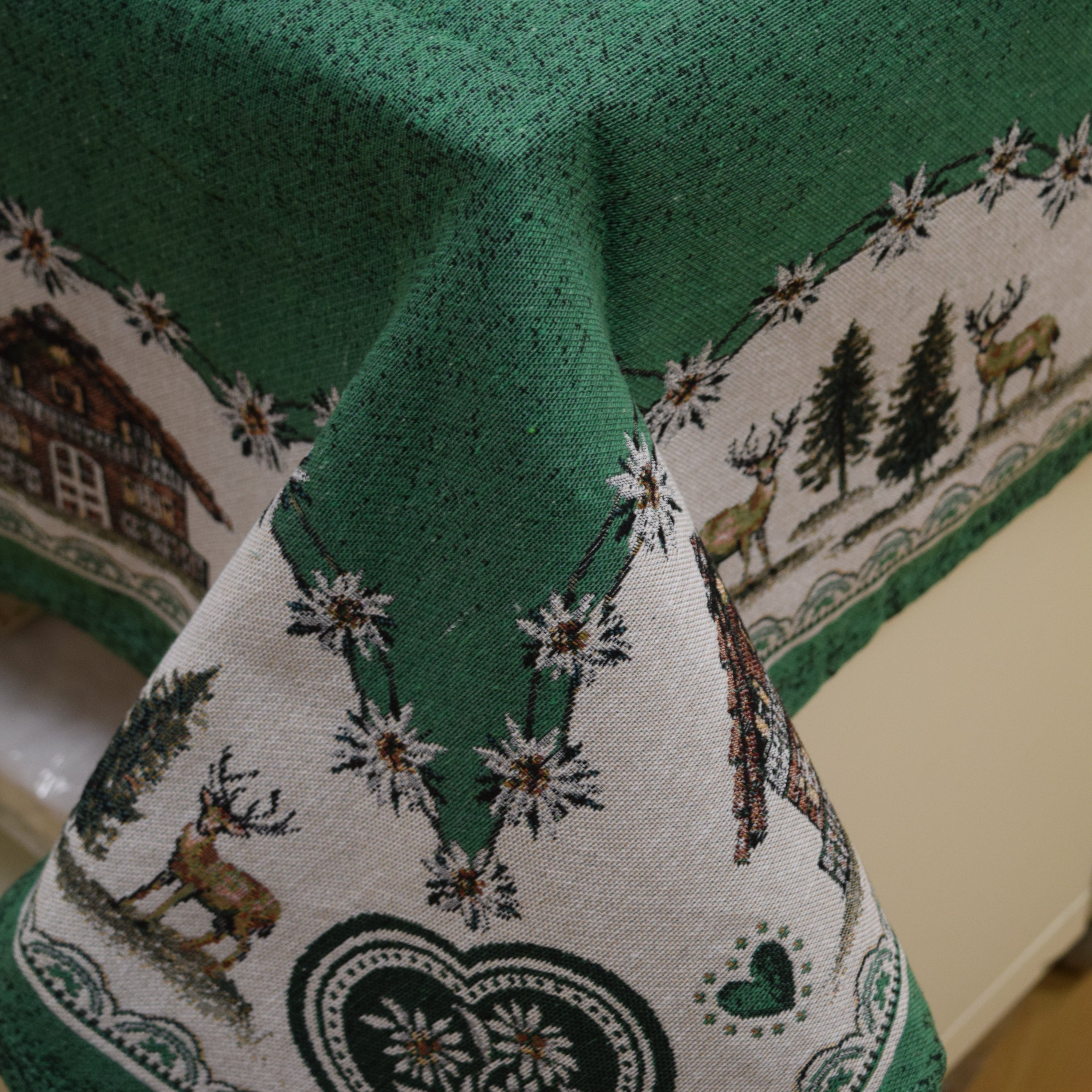 Questa tovaglia tirolese in pregiato tessuto Gobelin aggiunge un tocco di eleganza alla tua tavola. Disponibile nelle misure 140x180 cm e 140x240 cm, è perfetta per creare un ambiente accogliente e raffinato anche nella tua casa in montagna. La sua qualità artigianale e la tessitura densa la rendono ideale per ogni occasione speciale.