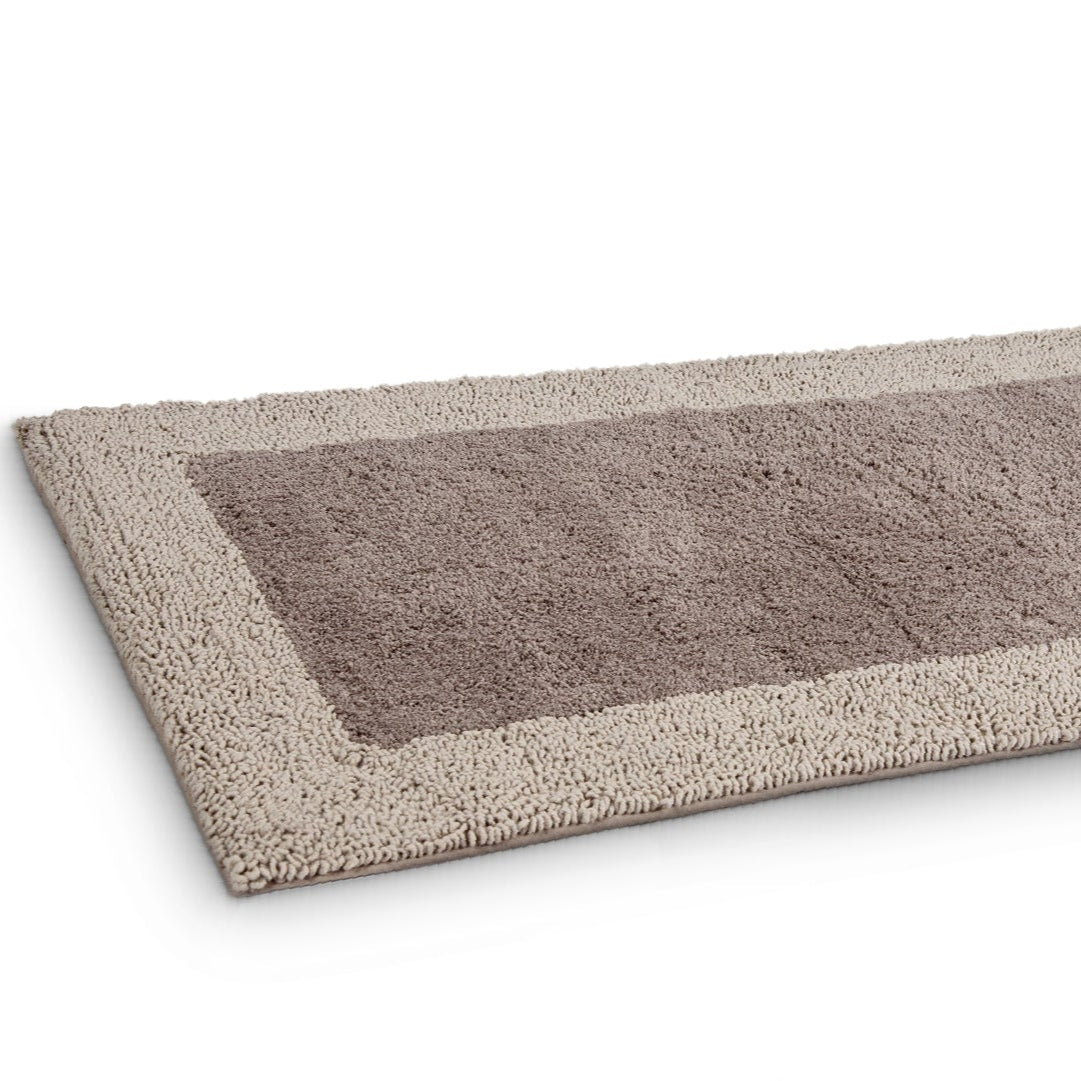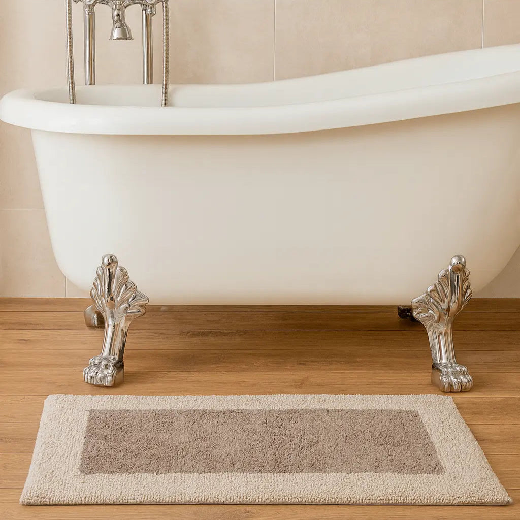 Rinnova il tuo bagno con stile e funzionalità grazie a questo tappeto realizzato in spugna di cotone, pensato per offrire comfort e massima assorbenza. La morbida texture in spugna assorbe rapidamente l’acqua e il fondo antiscivolo, garantisce stabilità e aderenza su tutte le superfici. Il design bicolore con cornice a contrasto aggiunge un tocco elegante e moderno a qualsiasi ambiente.