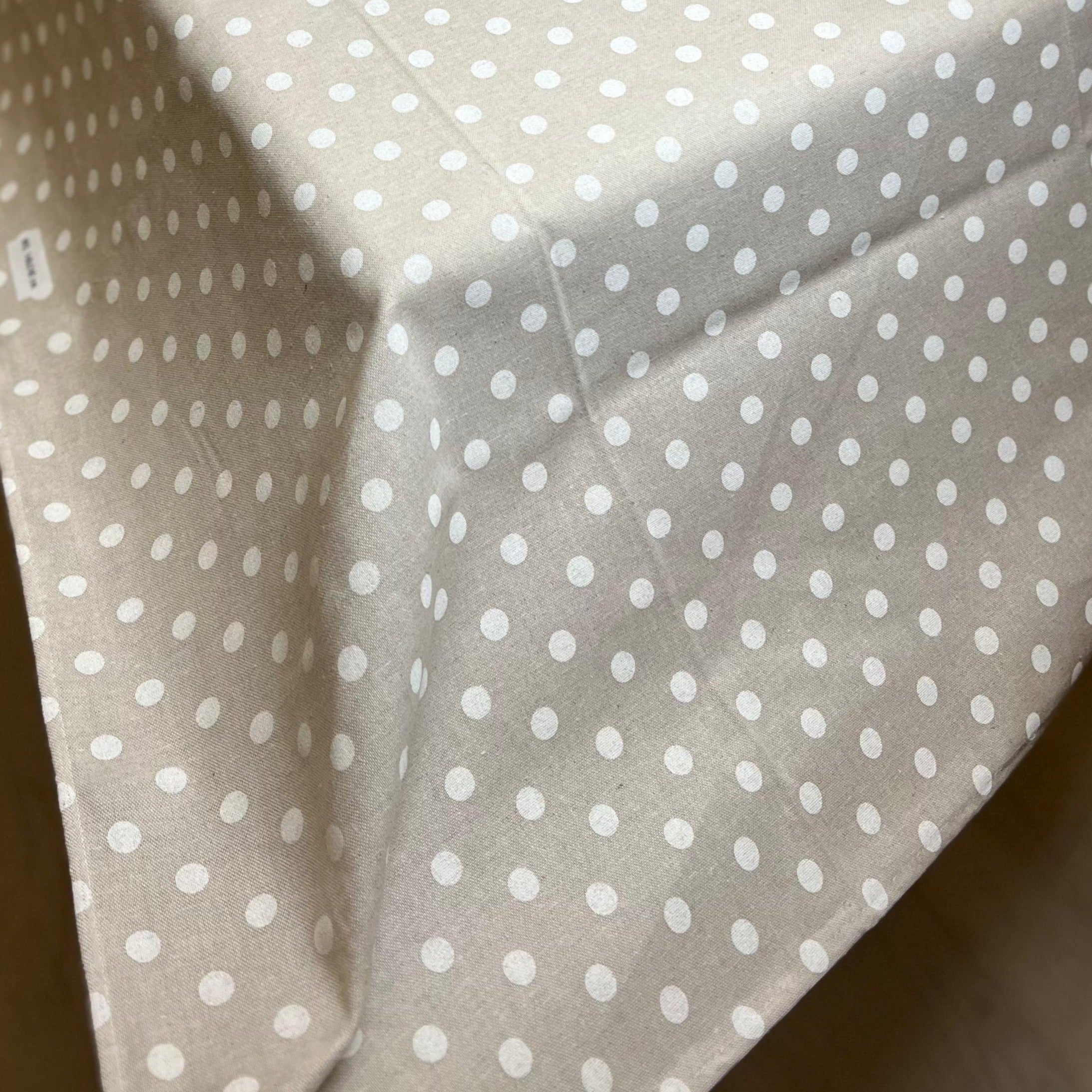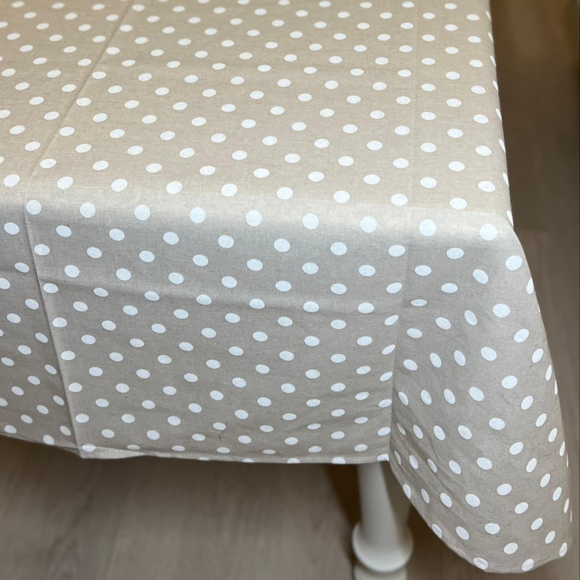 Mantel de lunares blancos con fondo de cuerda; composición 80% algodón y 20% poliéster para facilitar el lavado y reducir el encogimiento; Producto italiano.