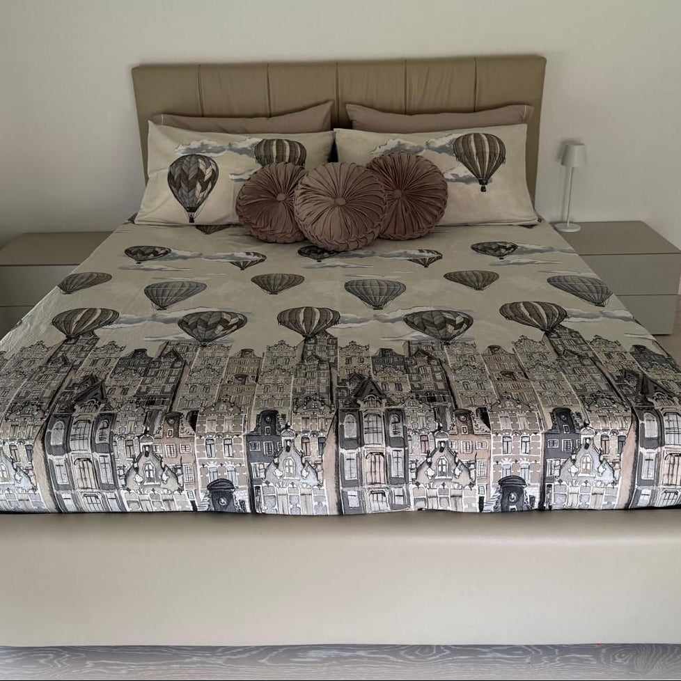 Misura: 250x200 cm + 40 cm di patella con rientro a imbuto. 2 federe a sacchetto double-face 52x82 cm;