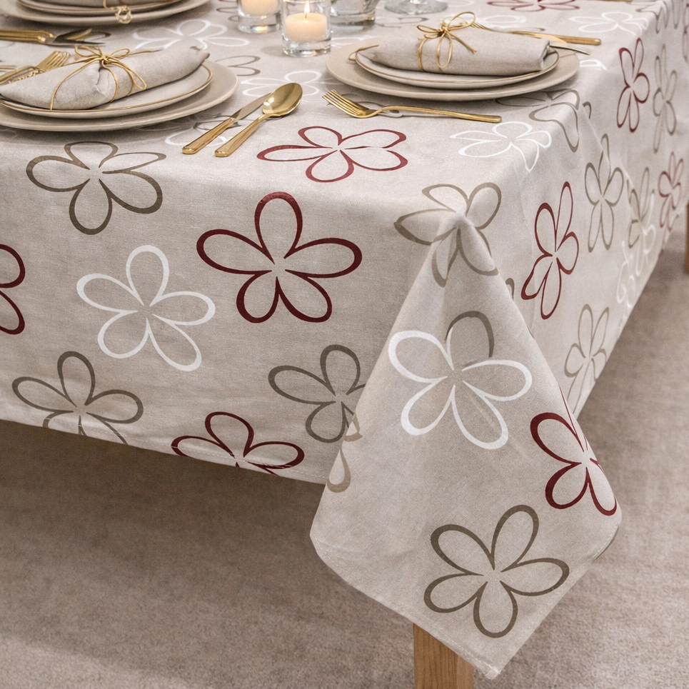 Tovaglia a fiori, composizione 80% di cotone e 20% di poliestere per facilitare il lavaggio e ridurne il calo; Prodotto made in Italy.